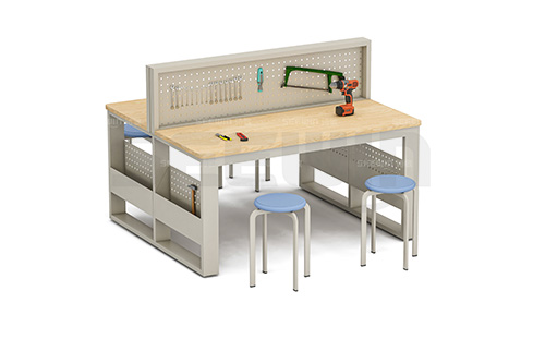 產(chǎn)品臺面采用橡膠木指接板,選材健康安全。桌面及兩側(cè)搭配洞洞板設(shè)計,方便教學(xué)使用。適用于