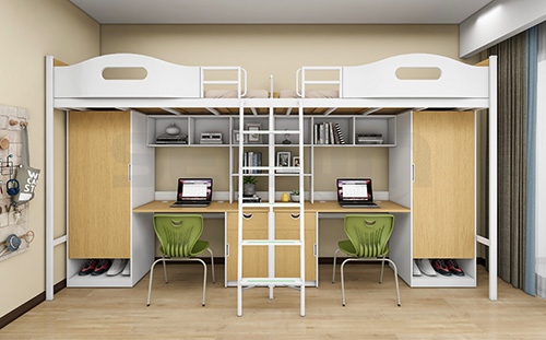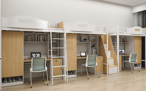 產(chǎn)品采用環(huán)保 E0 級(jí) MFC 板材,健康安全,結(jié)構(gòu)堅(jiān)固、經(jīng)久耐用。產(chǎn)品配置書柜、書桌,給學(xué)生提供獨(dú)立學(xué)習(xí)空間,衣柜、收納柜,可供學(xué)生日常生活使用。